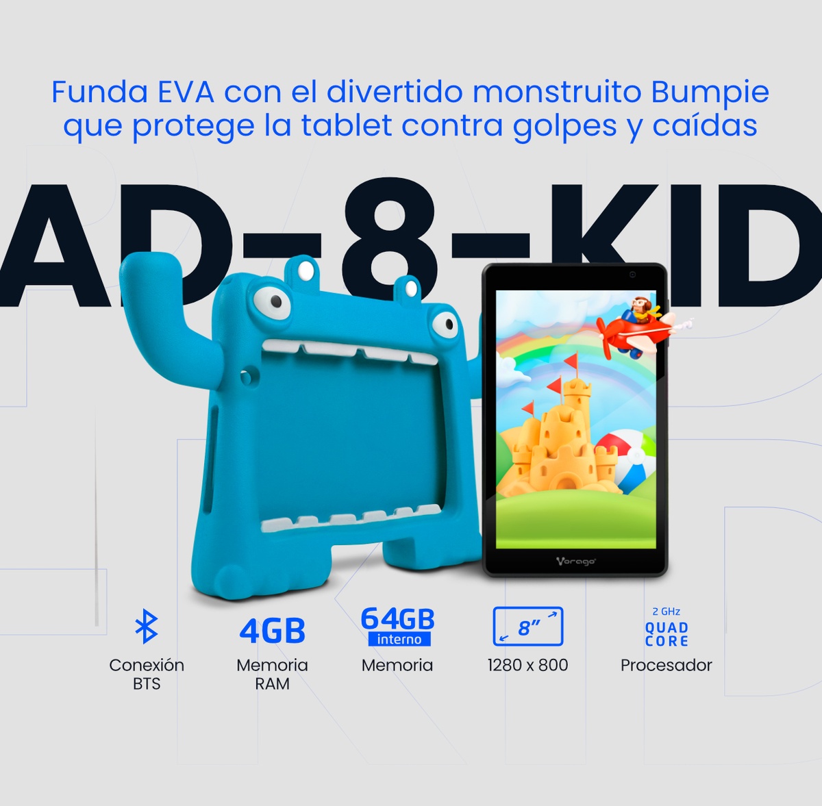 Vorago Tablet Pad-8-Kids 8 Android 13 Quadcore 4 GB Ram 64 GB Pantalla 1280 x 800 2Mp 5Mp IPS Almacenamiento Youtube Google Play Juegos Peliculas Tareas Escolares Tableta para Niños Funda Azul